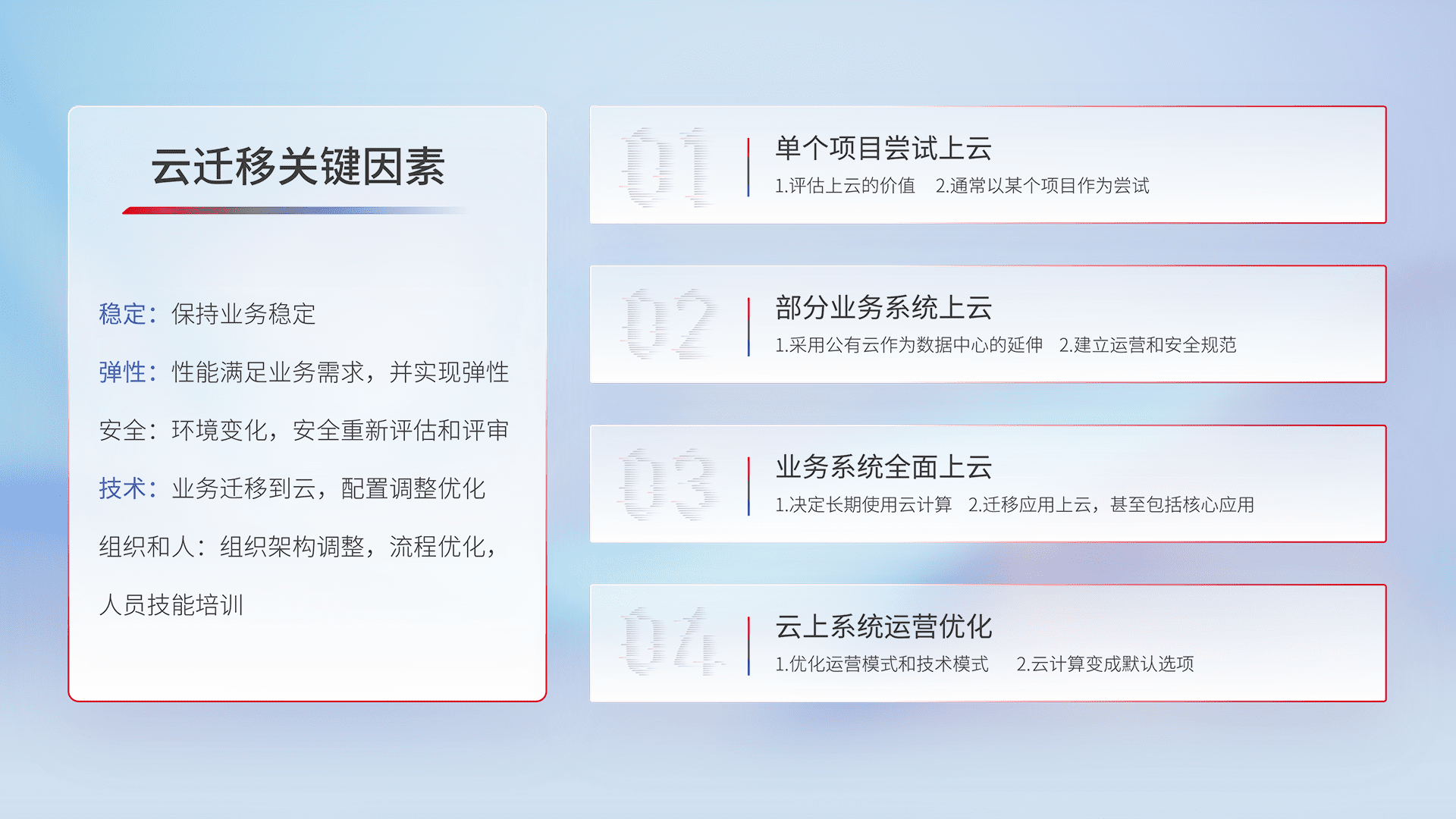 结合实际业务,,从规划设计、、、云平台选型、、、云原生改造、、、、数据迁移、、、、集成交付,,,迁移全过程为客户识别最佳上云路径,,,,做好风险识别管理,,,,设计网络架构、、身份权限、、、、安全审计合规、、操作审计、、、、日志审计、、、、监控告警策略、、、多站点容灾设计等,,对云上基础设施进行整体规划,,提升IT治理水平,,,以满足弹性、、、高可用、、、、高性能的需求。。