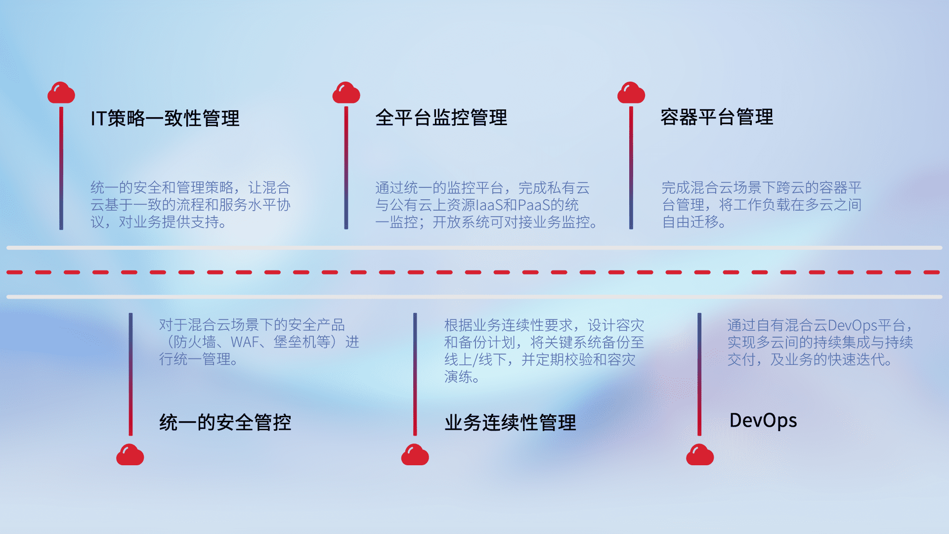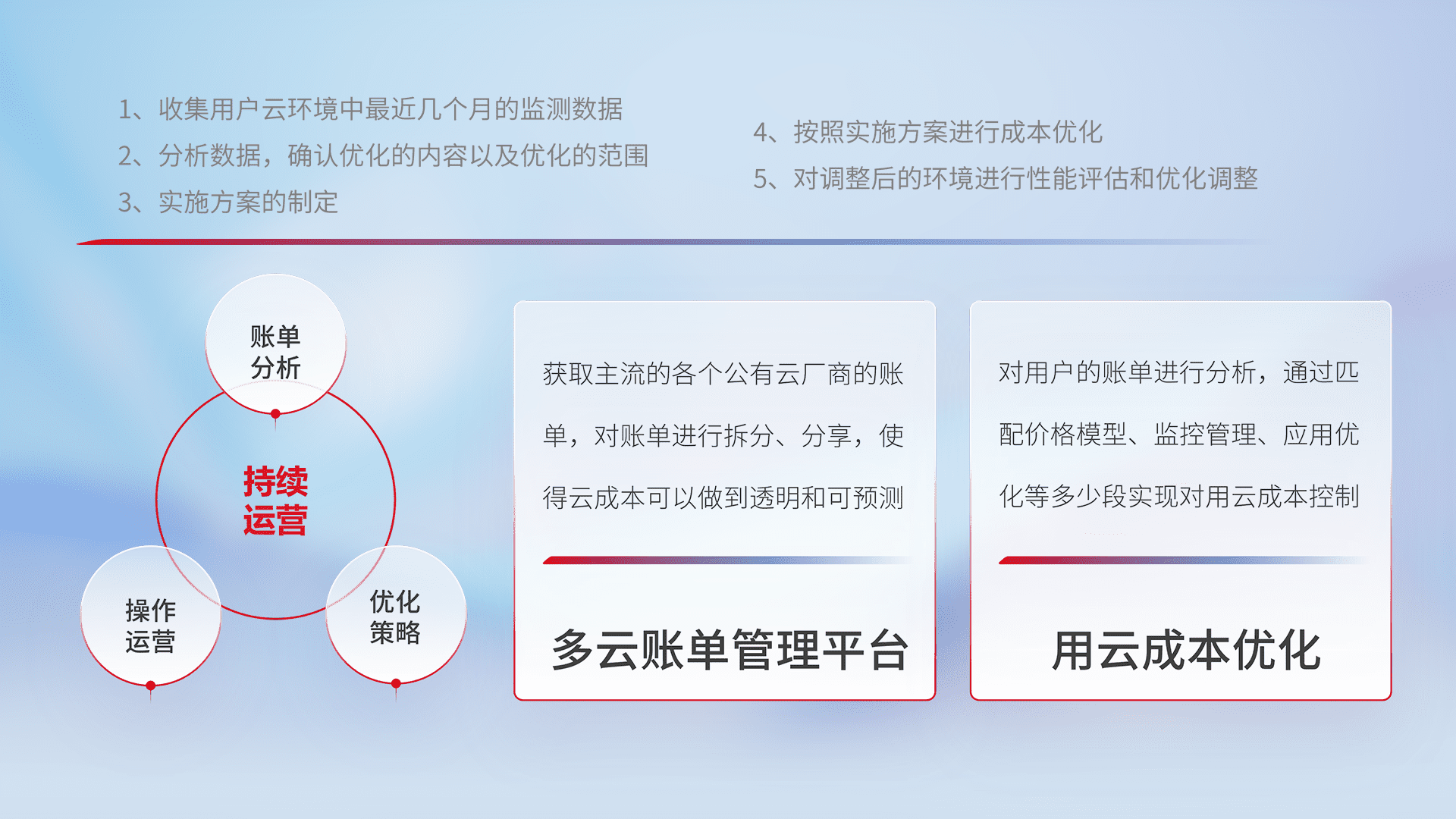 通过多云纳管,,,以统一的资源数据模型把客户的云资源进行抽象和封装,,,,进而实现对多云资源的统一操作,,,保障云资源管理的可靠性、、、稳定性与可用性。。。。量身定制化运维内容,,,,配置、、开发运维、、补丁管理、、、、备份、、、、监控、、、、认证和访问管理、、、、审计和日常巡检等,,,保障在用云过程中的可靠度,,稳定度以及高可用率。。。