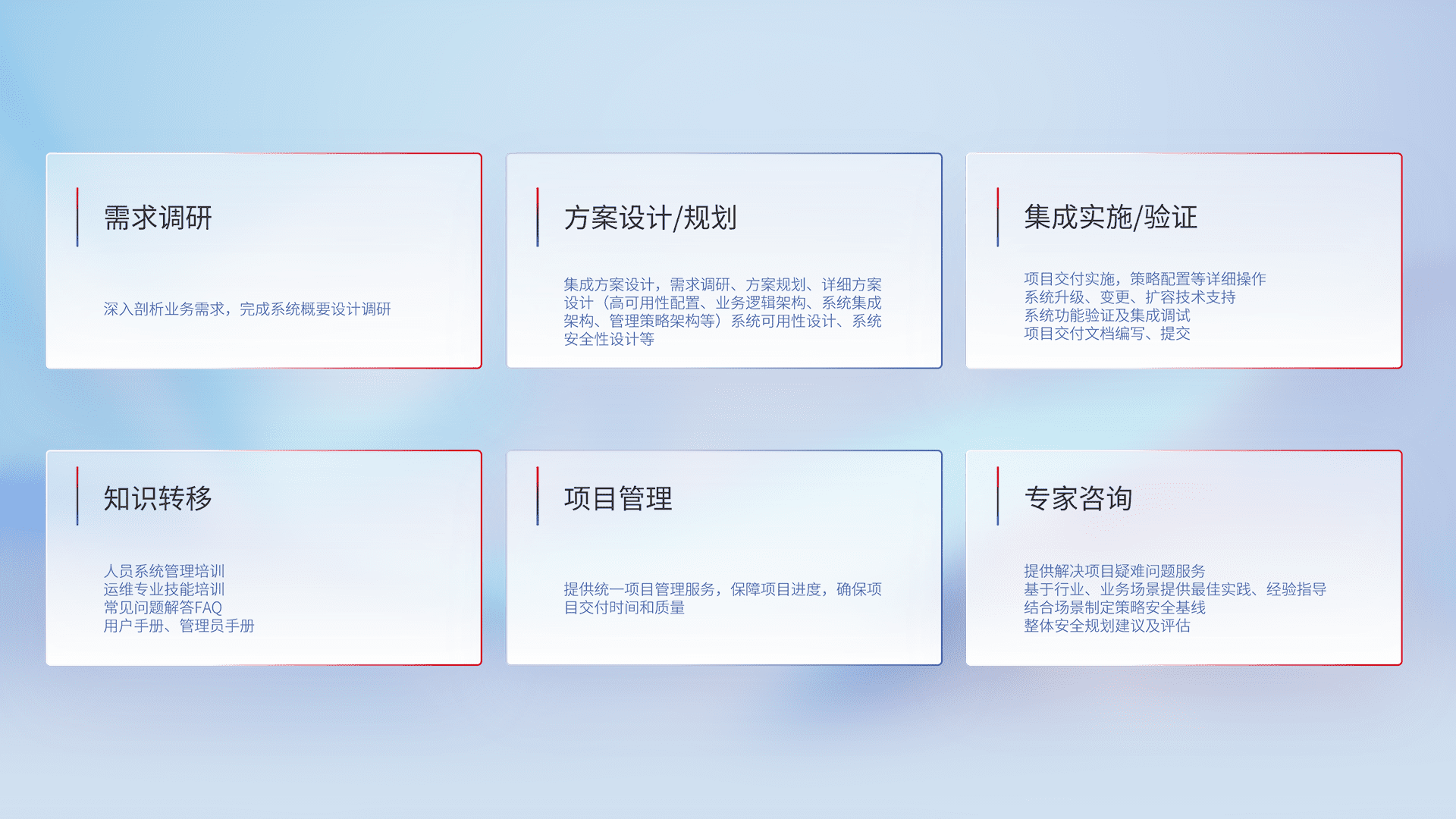 针对客户行业特性,,,,将宏观的安全战略和需求,,,通过专业的交付服务,,,,实现项目落地,,,为客户提供标准规范的集成交付服务。。。。